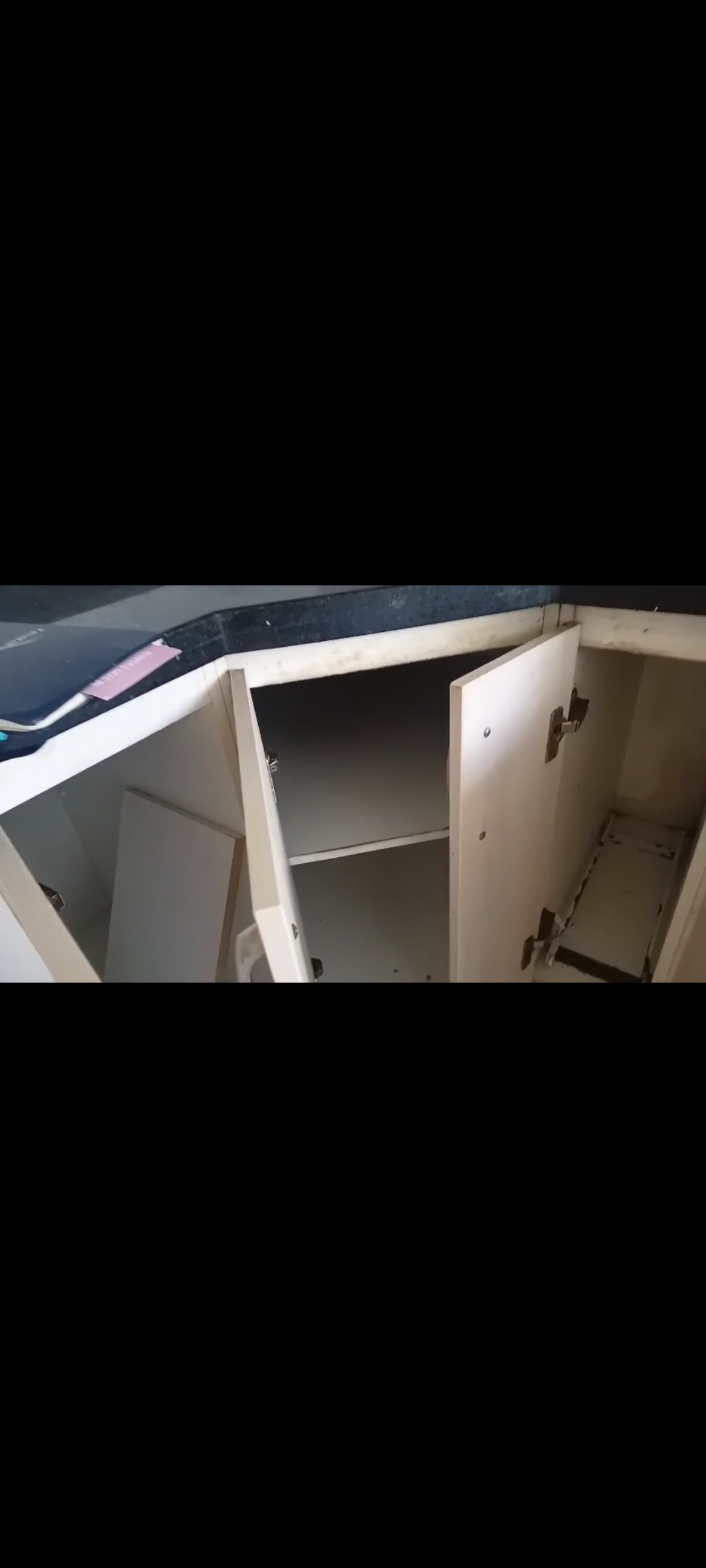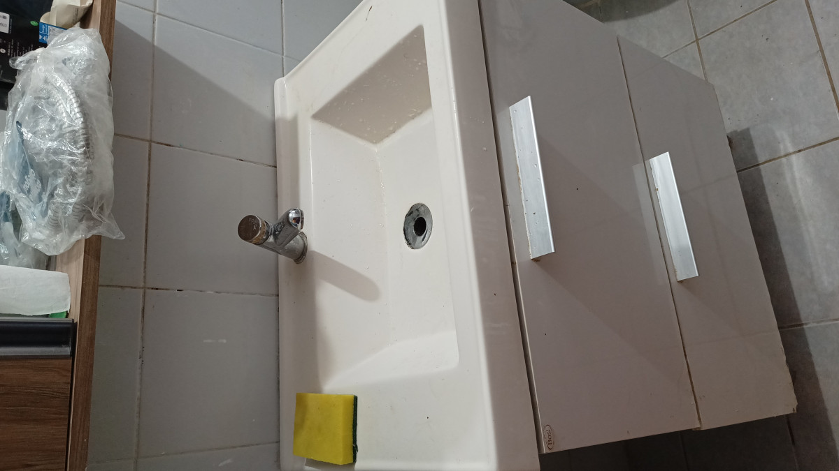 Nele tem 1 guarda-roupa daqueles de madeira antigos (tem cupim, mas não muito) e móvel de cozinha (o balcão da pia está inútil, mas o restante só está sujo), além de 1 balcão de banheiro com gavetas (está sujo)...