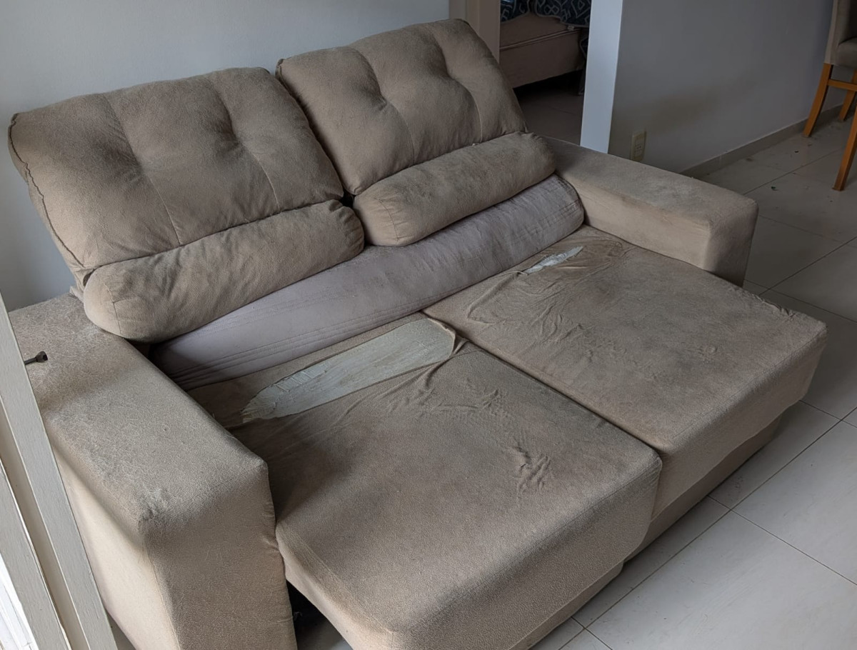 -sofá reclinável e retrátil, tá rasgado no estofado.
